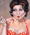 2014Dikke dame op strandstoel met fles champagne en gebakjes
